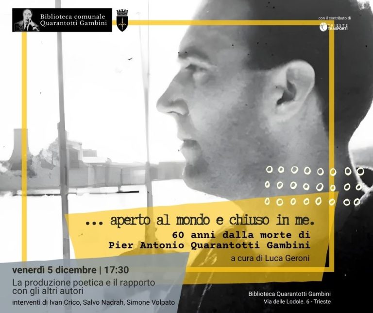 « … aperto al mondo e chiuso in me». A sessant’anni dalla morte di Pier Antonio Quarantotti Gambini. La produzione poetica e il rapporto con gli altri autori 24 Novembre 2025 Venerdì 5 dicembre, ore 17:30